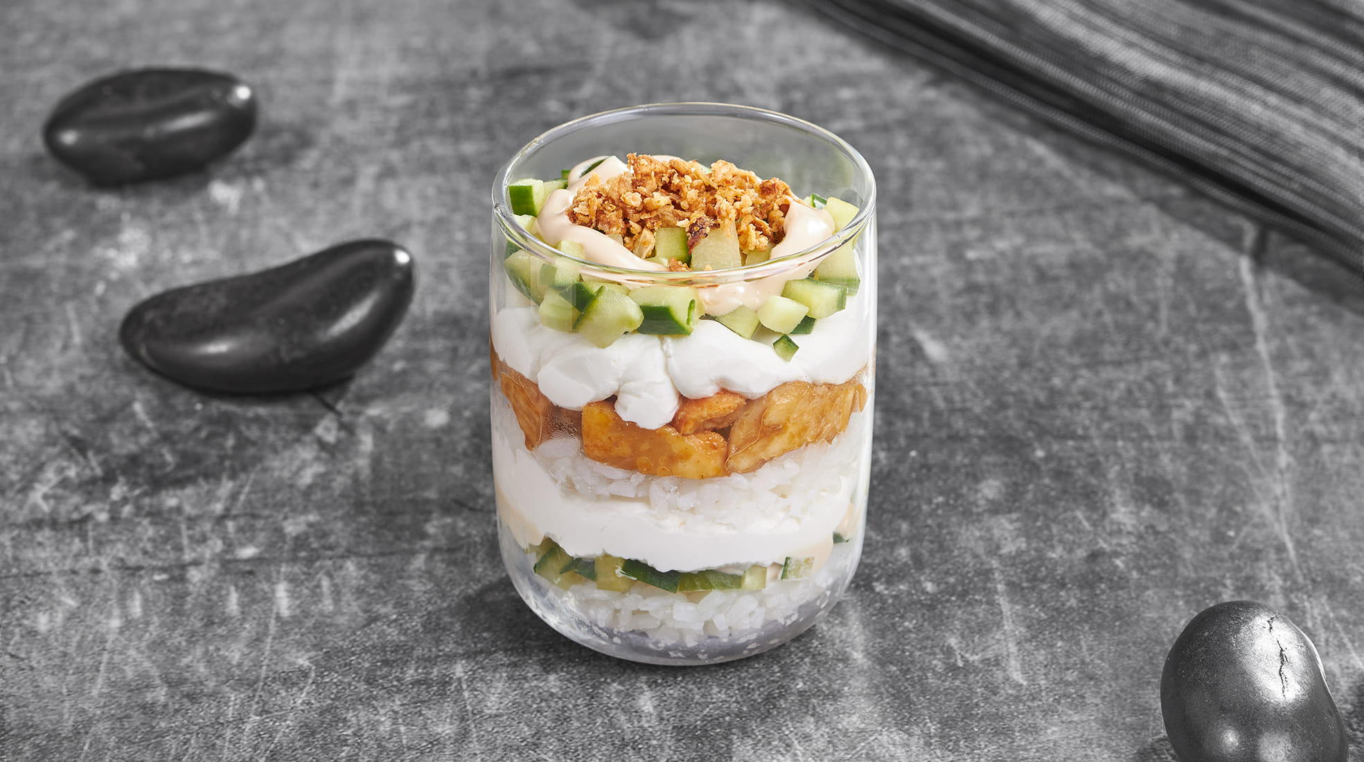 Крем чиз, огурец, курица, японский соус, лук фри рис. *Внешний вид блюда может отличаться от фото на сайте.