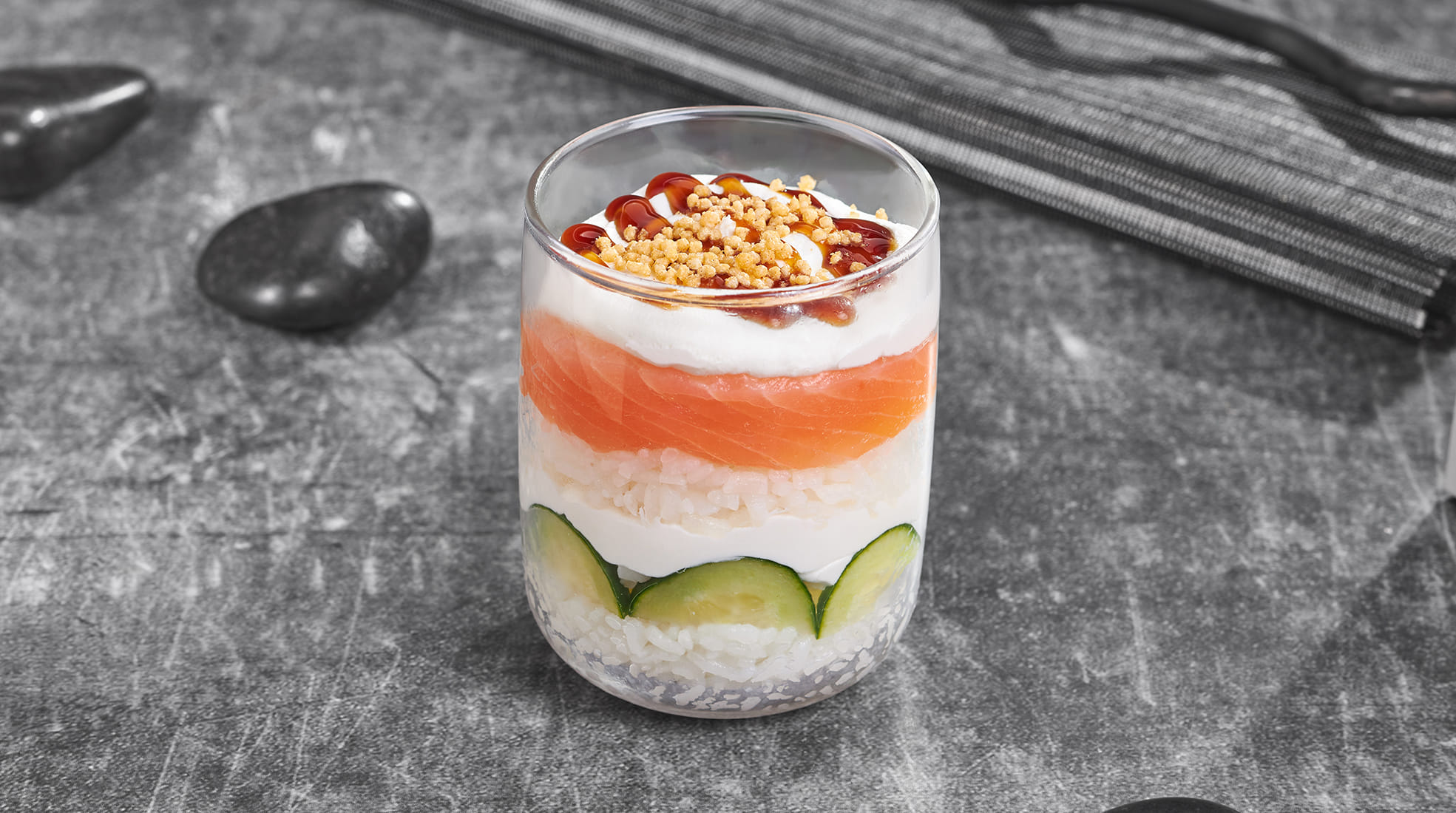 Крем чиз, лосось, огурец, японский соус, унаги соус, рисовые шарики (том ям), рис. *Внешний вид блюда может отличаться от фото на сайте.