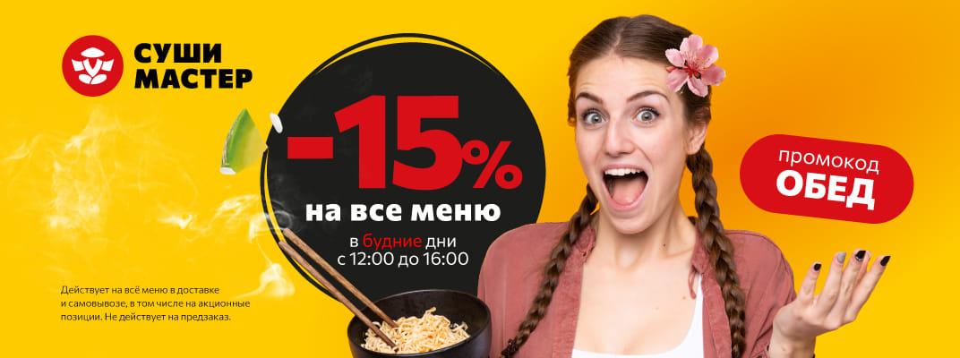 С понедельника по пятницу с 12:00 до 16:00 закидывай в корзину свои любимые роллы, горячий Вок или ароматный суп, а мы подарим на этот заказ СКИДКУ 15%!Промокод: ОБЕД (действует на все меню, так что не забудь про него в момент оформления)